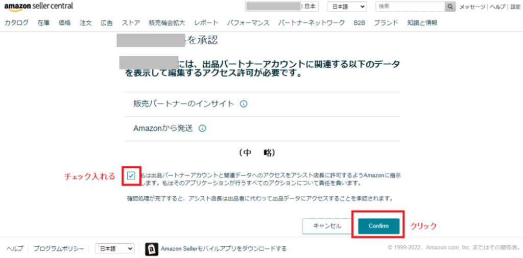 Amazonを複数店舗登録している場合は、 1店舗目の認証処理を実施した後、セラーセントラル画面でログアウトする必要があります。ログアウトの後、2店舗目で認証処理を実施してください。