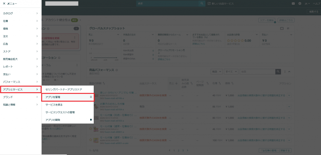 セラーセントラル画面左上のメニューからアプリとサービス>[アプリを管理]をクリックします。