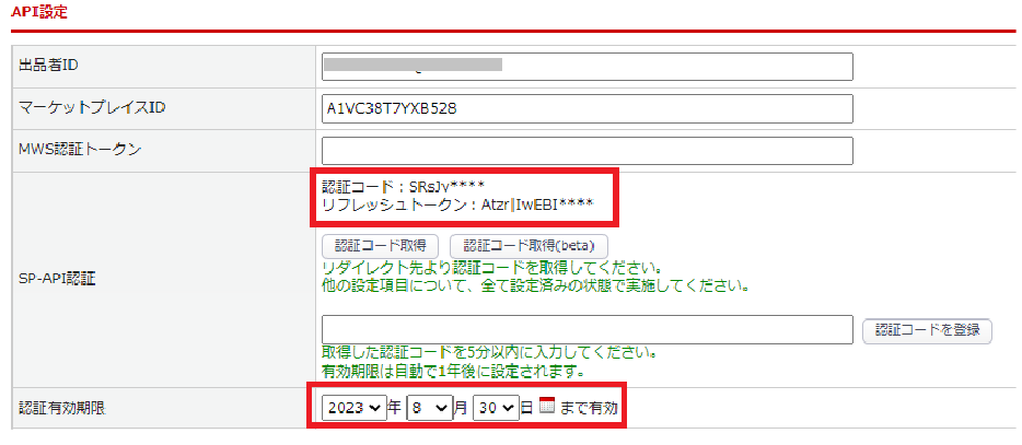 「SP-API認証」に「認証コード」、「リフレッシュトークン」に文字が表示されていることを確認します。