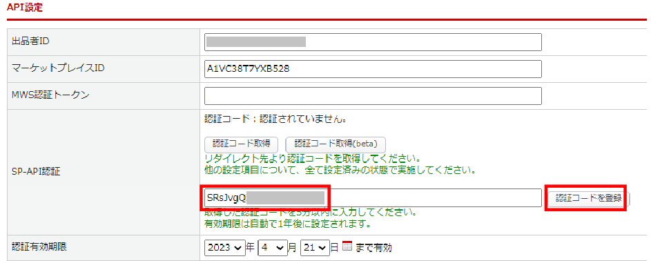「SP-API認証」(赤枠の箇所)に 3.sp-apiコードの確認 でコピーしたコードをペースト(貼り付け)し、