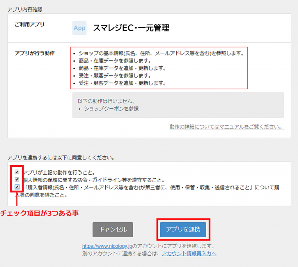 以下の画面が表示されます。3か所にチェックを付け、【[アプリを連携】ボタンをクリック