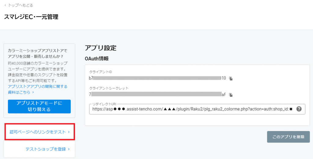| リダイレクトURL | https://asp●●●.assist-tencho.com/▲▲▲/plugin/Raku2/plg_raku2_colorme.php?action=auth:shop_id:■ ・●●●:お客様環境のサーバー名(数字) ・▲▲▲:お客様環境のドメイン名 ・■:スマレジEC・一元管理>店舗設定(カラーミー)の店舗ID(数字) ※店舗ID(数字例)→:環境設定>店舗設定>店舗ID ![]() |