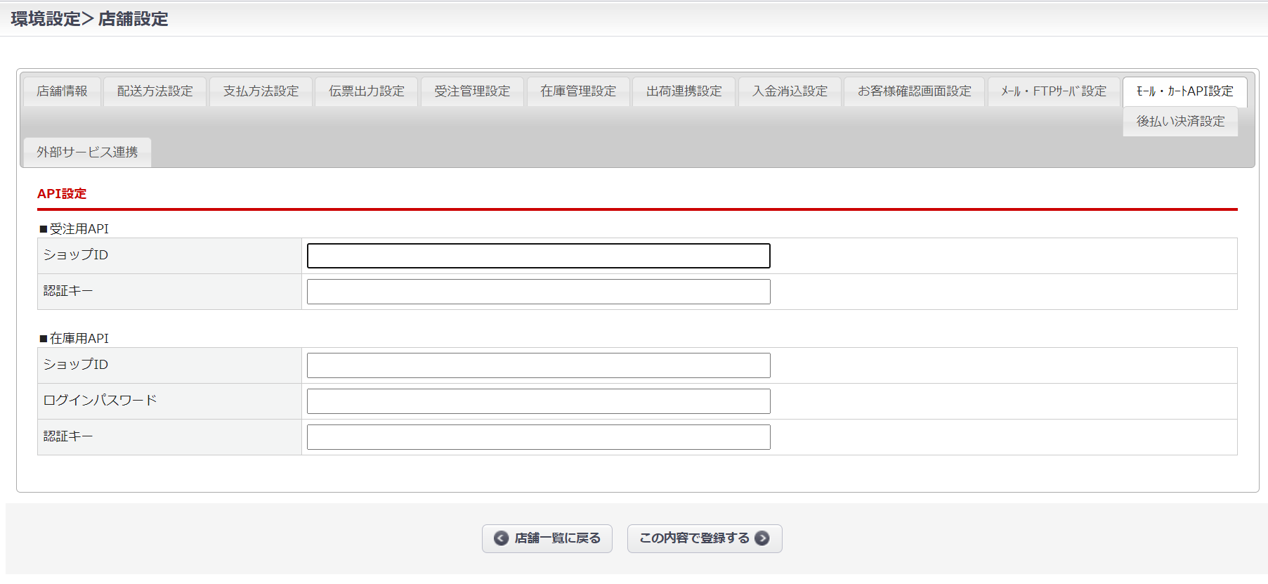 環境設定>店舗設定>「モール・カートAPI設定」タブ