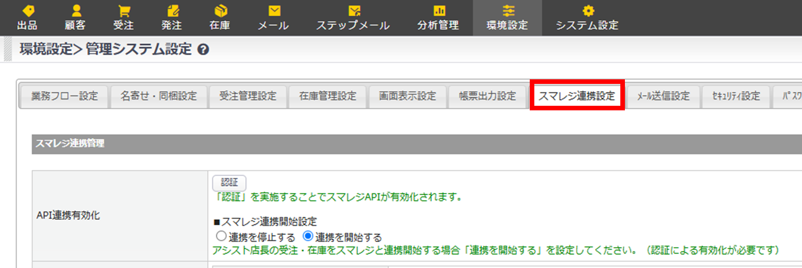 環境設定>[管理システム設定]>[スマレジ連携設定]タブの設定が必要です。