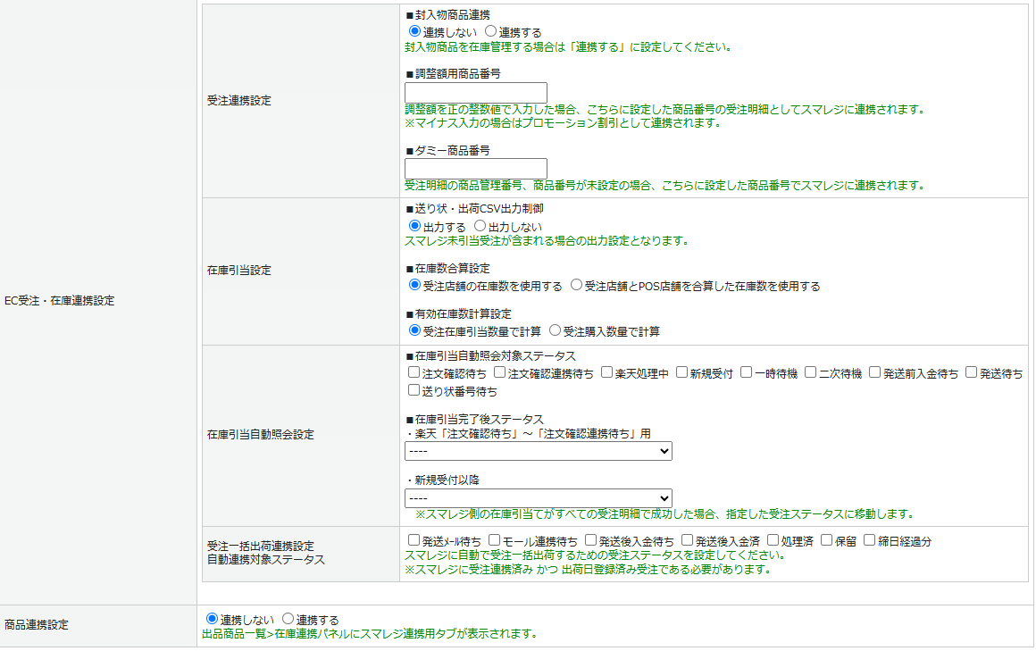 | 受注連携設定 | ■封入物商品連携 封入物商品を在庫管理する場合は[連携する]を選択してください。 ■調整額用商品番号 調整額を正の整数値で入力した場合、この項目に設定した商品番号の受注明細として、 スマレジに連携されます。 ※マイナス入力の場合はプロモーション割引として連携されます。 ■ダミー商品番号 受注明細の商品管理番号、商品番号が未設定の場合、 こちらに設定した商品番号でスマレジに連携されます。 |