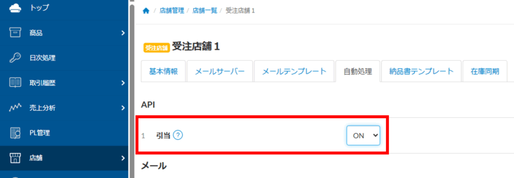 対象店舗の詳細画面から[自動処理]タブを開き、「引当」の設定を変更してください。
