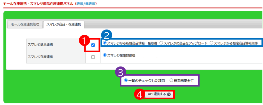 - 「スマレジ商品連携」欄にチェックを入れ、実行する操作を選択します。