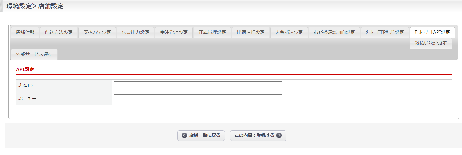 - 認証キー:【ショップサーブ APIのお申込み方法:STEP2】で取得したキーを入力