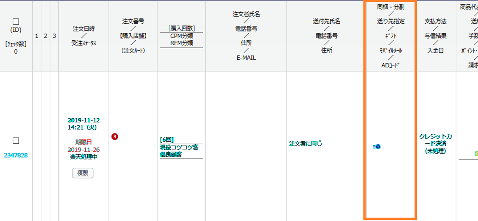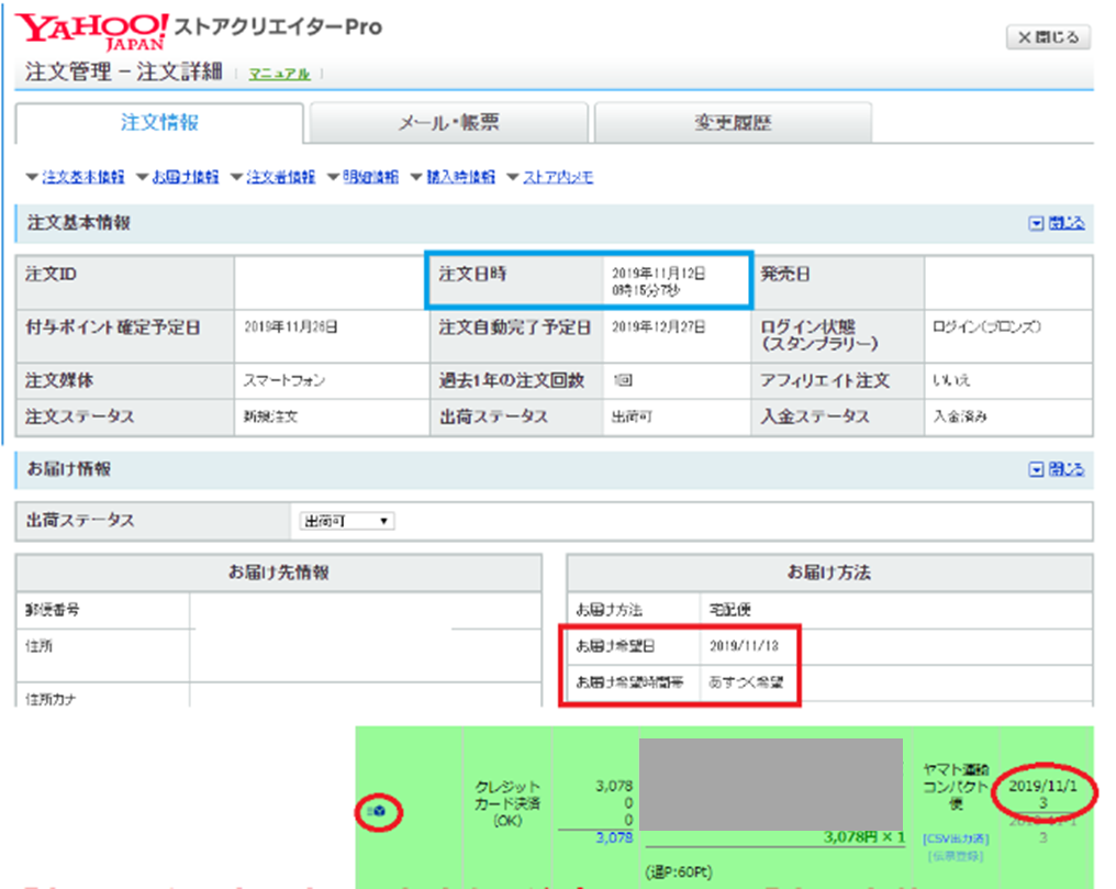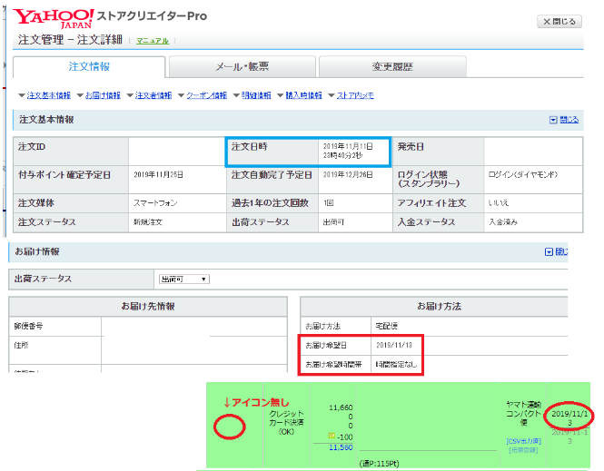 注文日11/12に対し、お届け希望日は11/13となり、お急ぎ便アイコンが表示されます