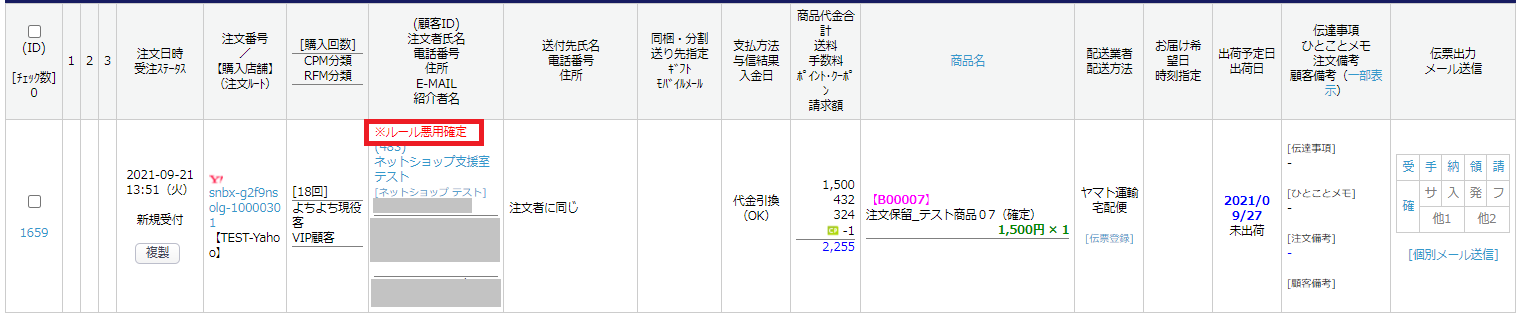 確定時:不正保留(審査中)→ルール悪用確定された場合に遷移する受注ステータスになります。