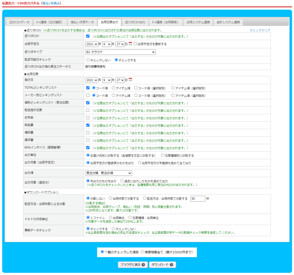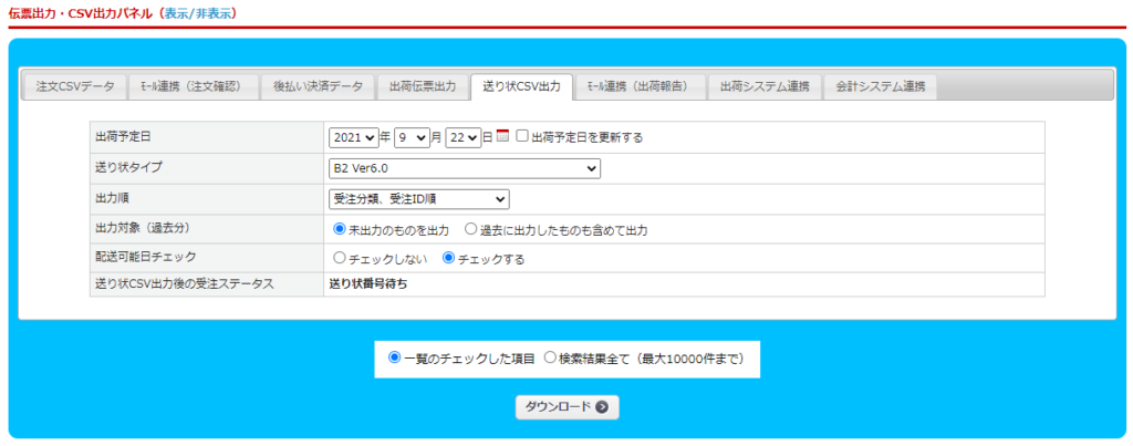 受注>受注一覧 伝票出力・CSV出力パネル>「送り状CSV出力」タブと「出荷システム連携」タブ