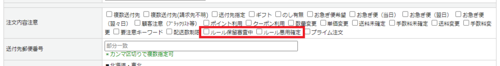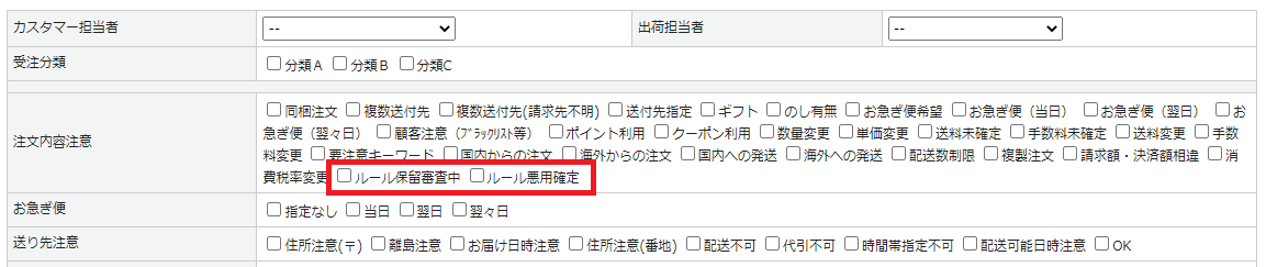 受注>受注一覧>絞り込みパネル>「出荷業務検索」タブ の注文内容注意に「ルール保留審査中」「ルール悪用確定」の項目が追加されました。審査中や悪用確定の受注の絞り込み検索が可能です。