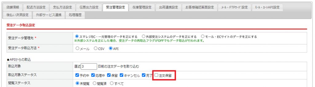環境設定>店舗設定>Yahoo店[編集]>「受注管理設定」タブ 取込対象ステータス「注文保留」