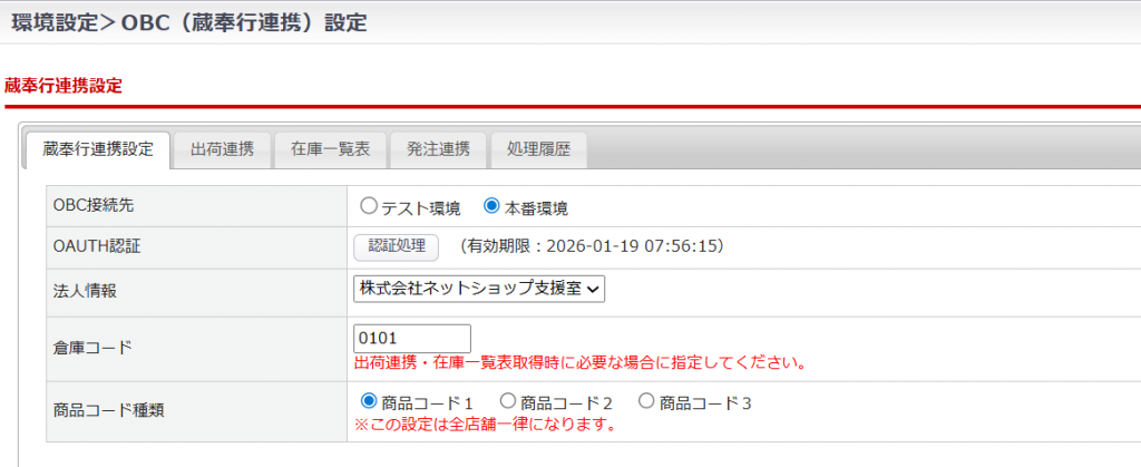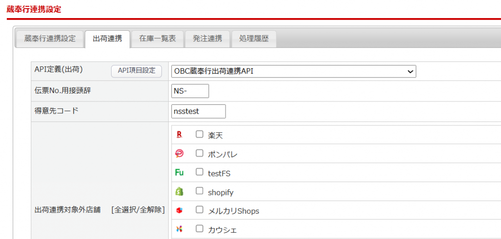 | API定義(出荷) | 利用する場合は、OBC蔵奉行出荷連携APIを選択します。 |