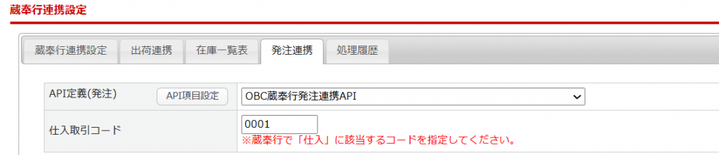 | API定義(発注) | 利用する場合は、OBC蔵奉行発注連携APIを選択します。 |