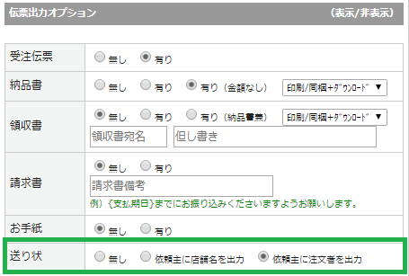 ※「有り(依頼主に店舗名を出力、注文者と送付先が違う場合、注文者を出力)」の場合は、注文者情報と送付先情報が同一の場合に依頼主に店舗情報が出力されます。