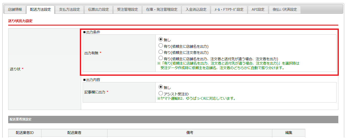 ※出力される店舗情報は同画面内の配送業者別設定にて、配送業者ごとに設定が可能です。