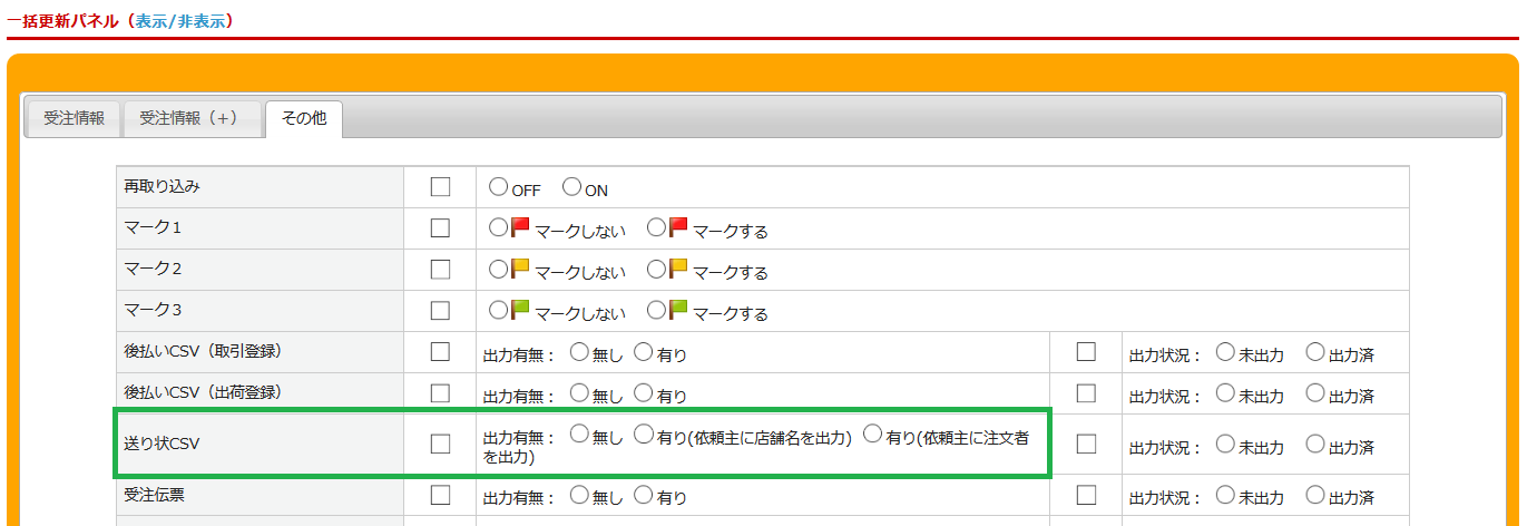 3.「送り状CSV」のチェックボックスにチェックを入れ、「有り(依頼主に注文者を出力)」を選びます