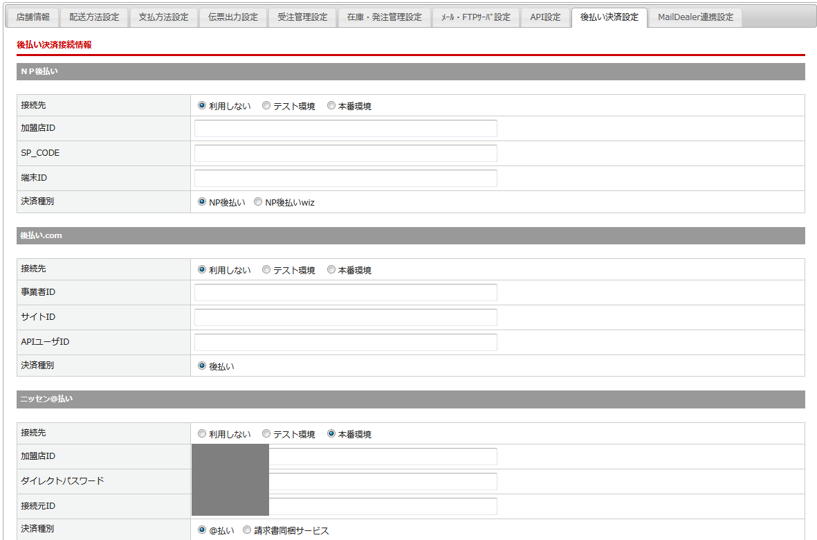環境設定>店舗設定>各店舗の「編集」リンク>「後払い決済設定」タブ