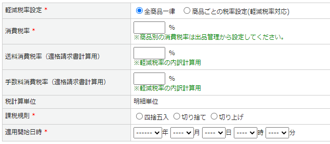 | 軽減税率設定 | 税率設定の適用範囲を指定します。 ・全商品一律:税率設定で設定された消費税率を全商品に適用 ・商品ごとの税率設定:出品管理にて設定された消費税率を適用 ※出品管理にて未設定の場合は税率設定の内容が適用 |