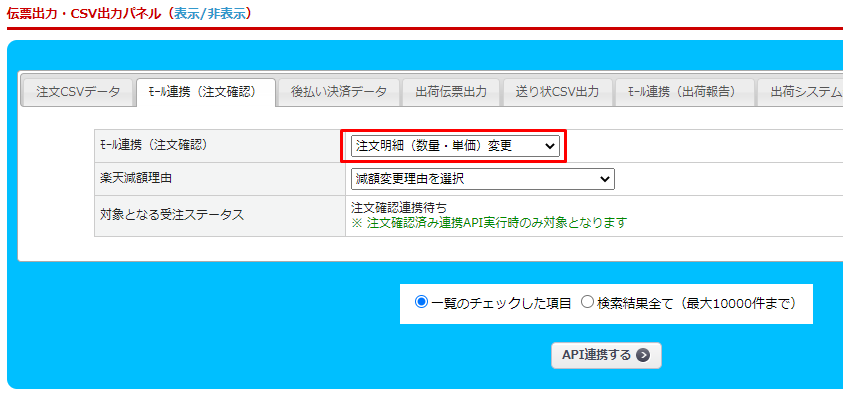 受注管理>伝票出力・CSV出力パネル>「モール連携(注文確認)」タブ