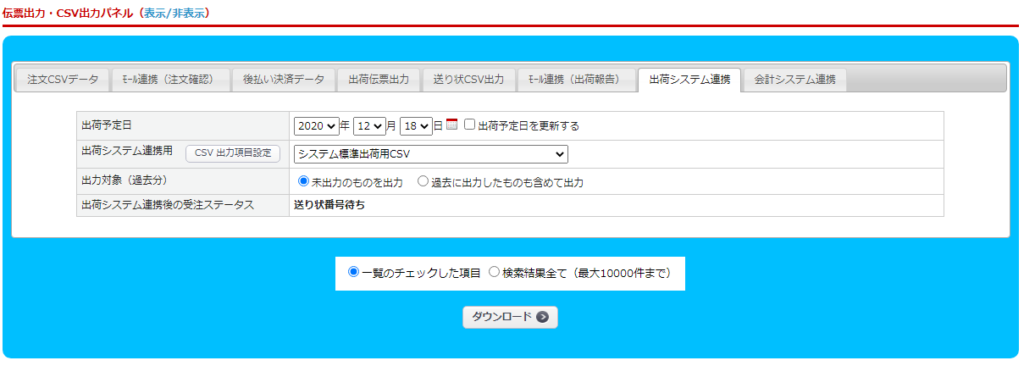 伝票出力・CSV出力パネル>出荷システム連携タブ の