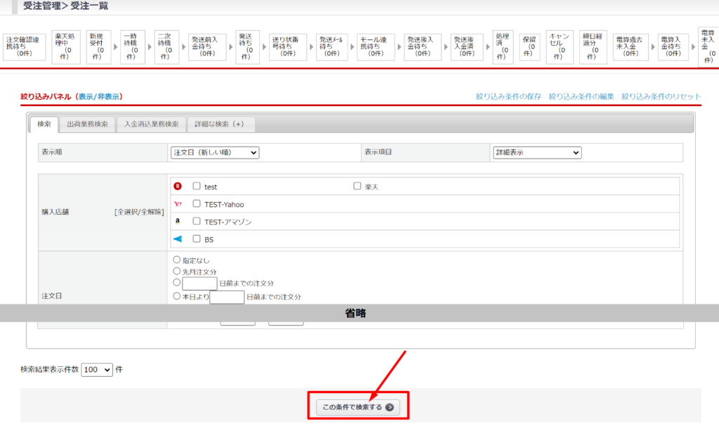 ※CSV出力時に「検索結果全て」を選択する場合はここで抽出した受注データ全て(最大10000件)が出力対象となります。