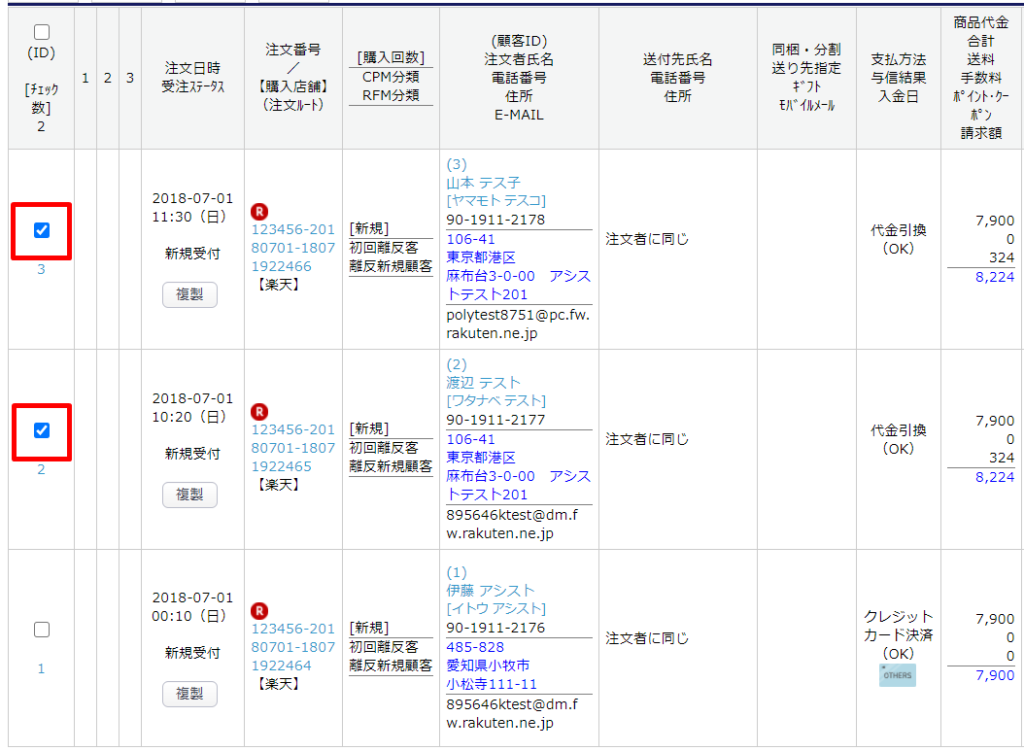 検索結果一覧にて、出力対象とする受注データの「ID」欄にチェックを入れます。