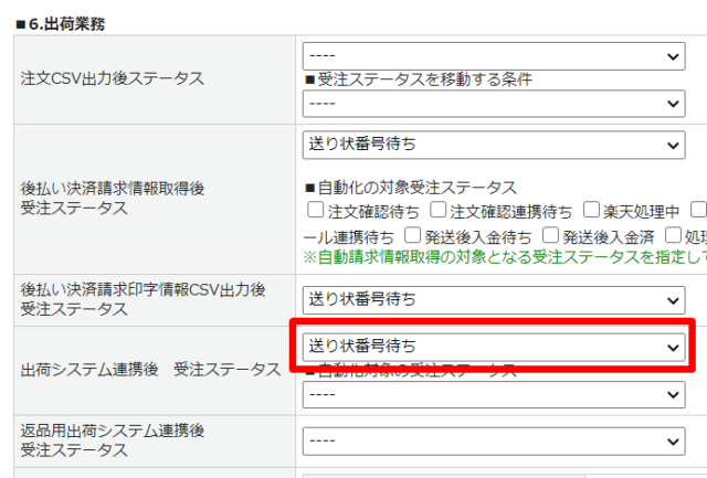 出力が完了した受注データは、ここで表示されている受注ステータスに遷移します。 この受注ステータスは、「環境設定>管理システム設定>業務フロー設定タブ>■6.出荷業務>出荷システム連携後 受注ステータス」にて設定可能です。 |