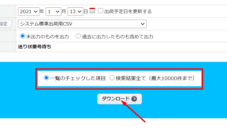 ※出荷予定日が未設定の受注データは出力対象外となりダウンロードできません。