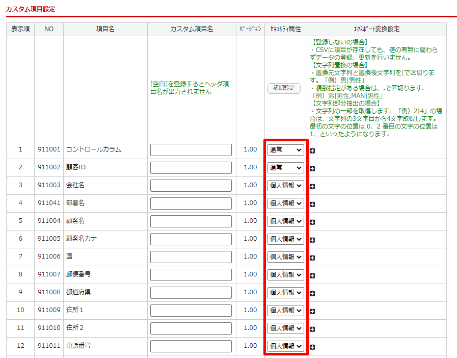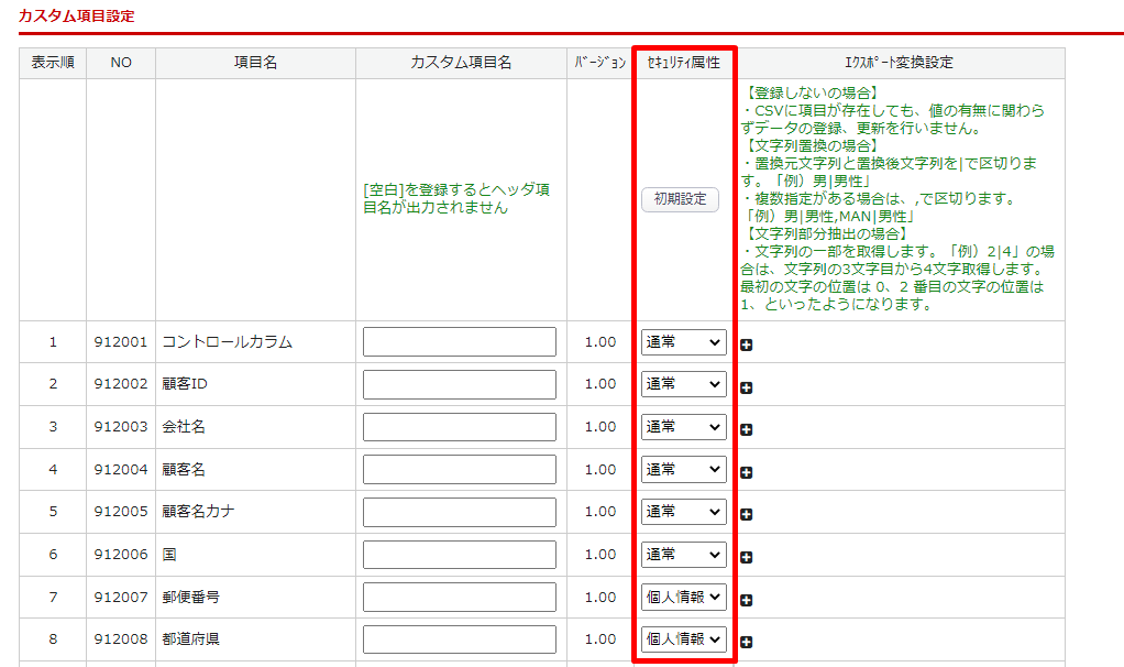 1.システム設定>カスタムCSV管理 の各カスタムCSV編集画面の「CSV項目設定」タブのセキュリティ属性を設定する