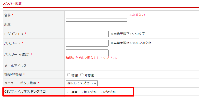 2.システム設定>メンバー管理 のメンバー登録/編集画面にて、「CSVファイルマスキング項目」を設定する