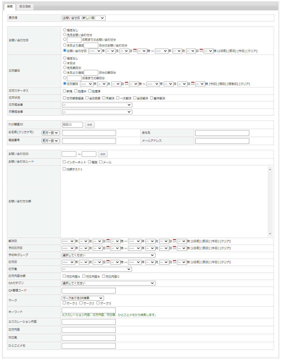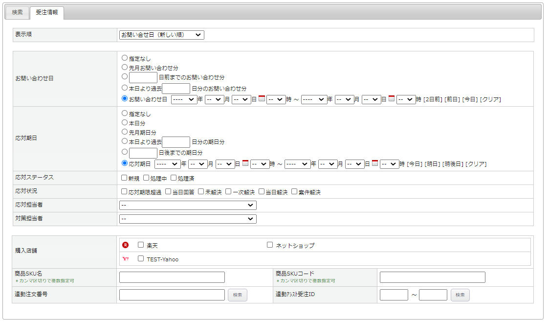 「検索」タブ、「受注情報」タブにてそれぞれ詳しい条件での検索ができます。