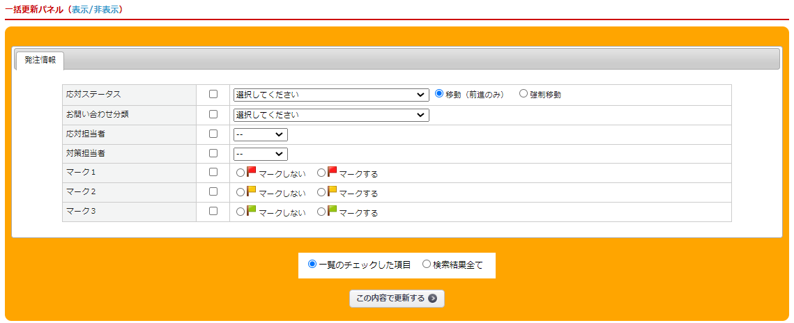 更新対象は「一覧のチェックした項目」または「検索結果全て」より選択してください。