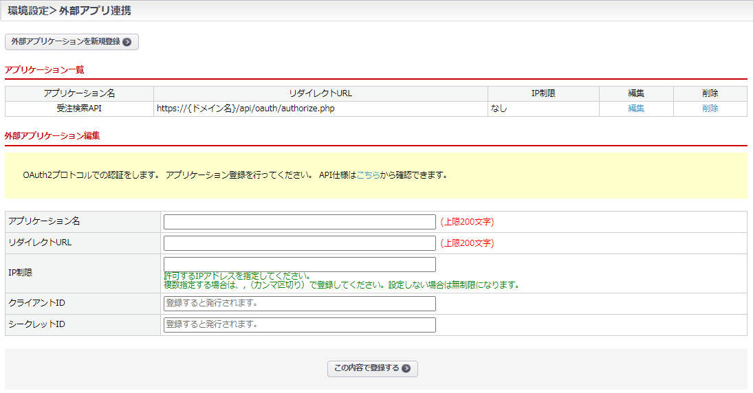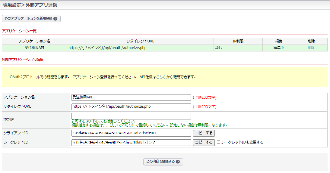 【外部アプリケーションを新規登録】ボタン、「アプリケーション一覧」の「編集」リンクをクリックし、
