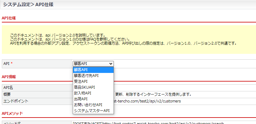 外部アプリケーション編集下部の黄色枠内に設置されている「こちら」リンクをクリックすると、「システム設定>API仕様」にて各種API仕様の確認ができます。