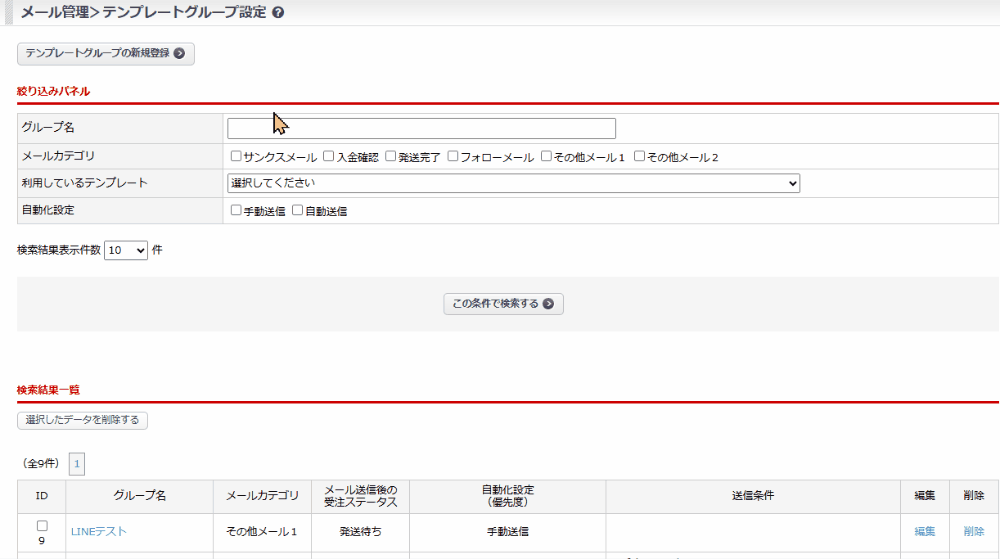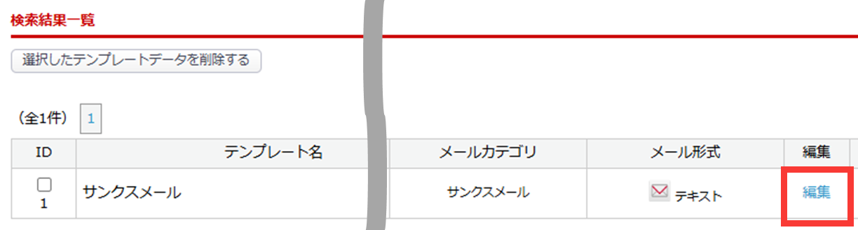 ページ下部の検索結果一覧から、編集したいテンプレートの[編集]をクリックします。