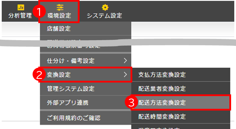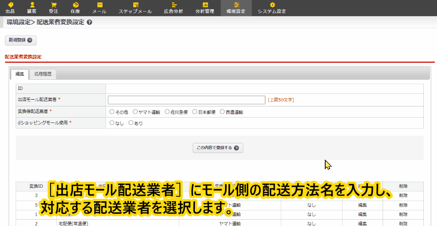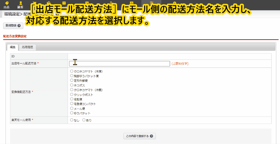利用する配送業者と配送方法が登録できたら、支払方法と同様に変換設定を行います。