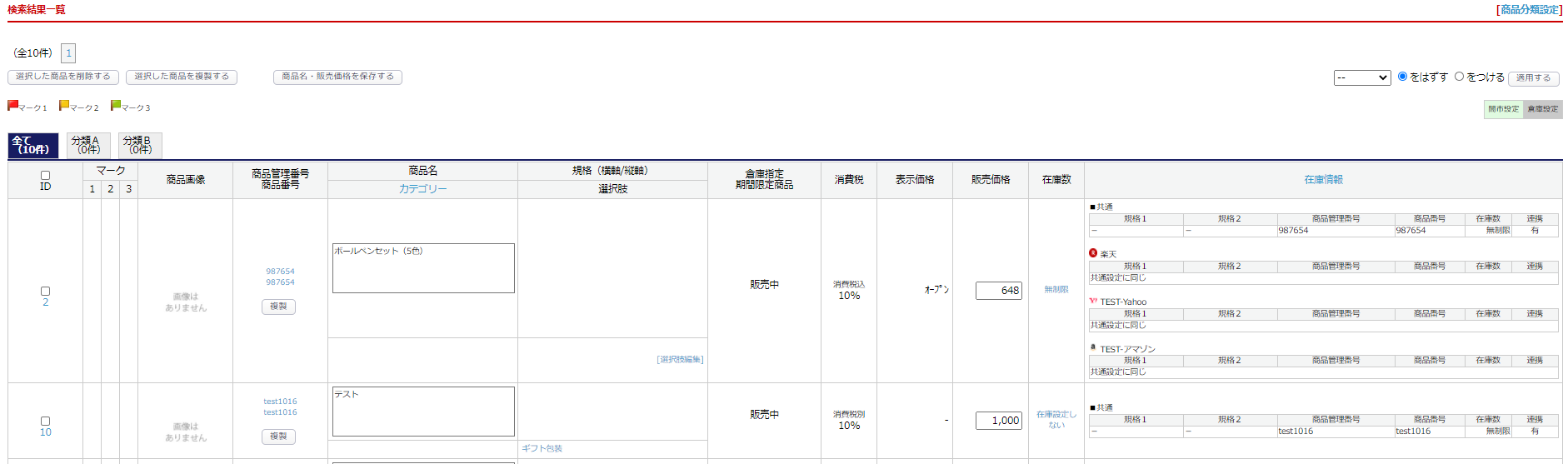 商品管理番号、商品番号を表示します。【複製】ボタンをクリックすると、 商品情報設定(商品IDを除く)を保持した出品商品登録画面が表示されます。 ※複製元商品の商品管理番号、商品番号との重複にご注意ください。 |