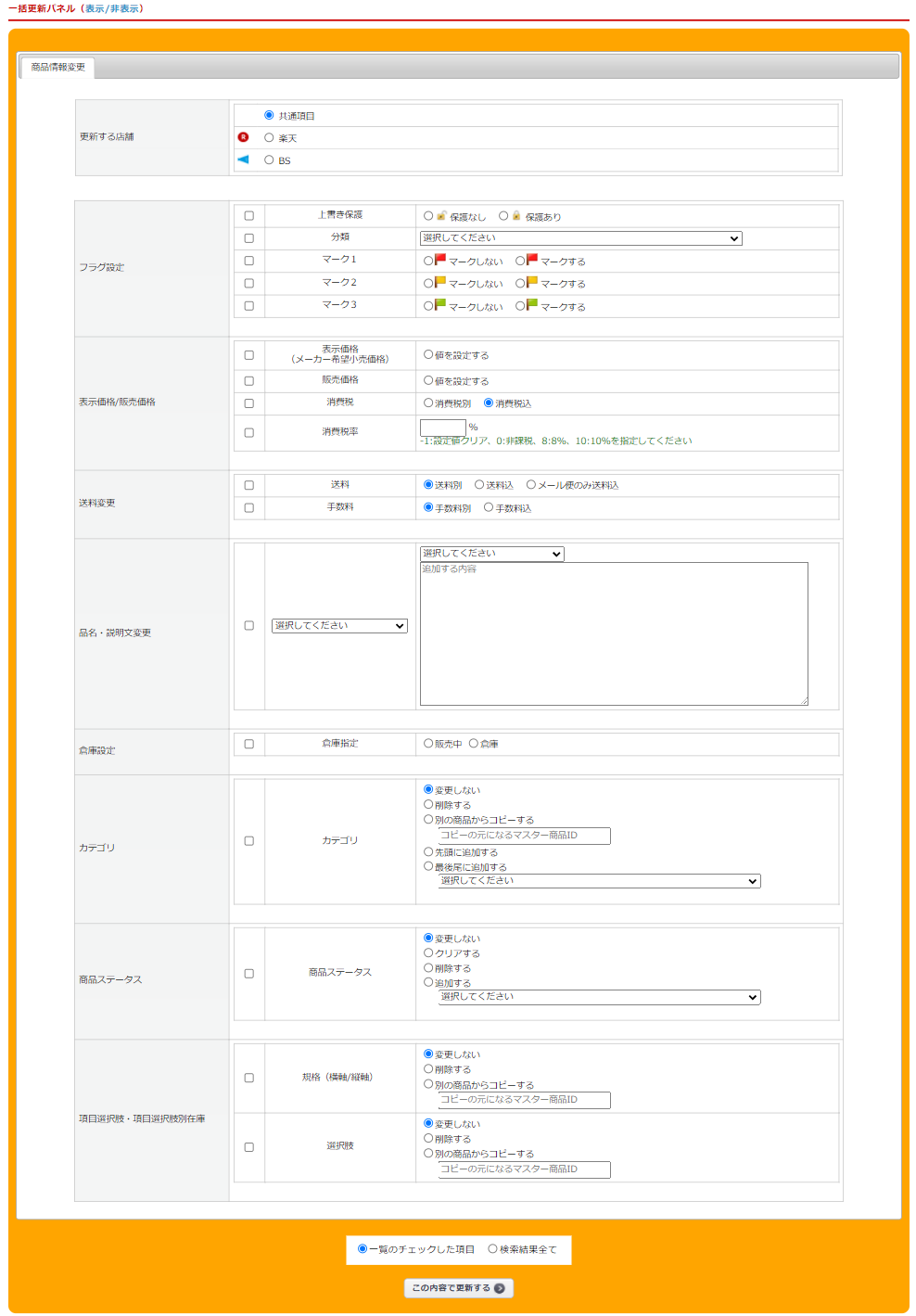 | 更新する店舗 | チェックした商品の更新する店舗を指定します。 店舗ごとの更新できる項目は、出品商品登録画面の{店舗別商品情報}タブに 表示されている項目に対応しています。 |