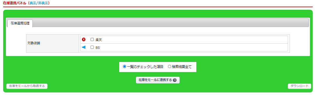 - 中央:【在庫をモールに連携する】ボタンを押すと、選択した「対象店舗」へ