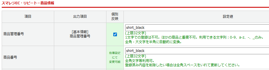例)商品番号 モール:shirt_black スマレジ:shirt_black_shirt