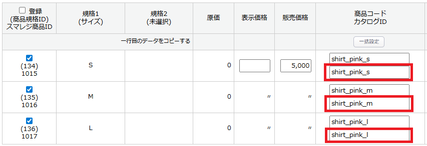 項目選択肢別在庫設定のカタログID(JANコード)に「shirt_pink_s」「shirt_pink_m」「shirt_pink_l」(スマレジの商品番号)