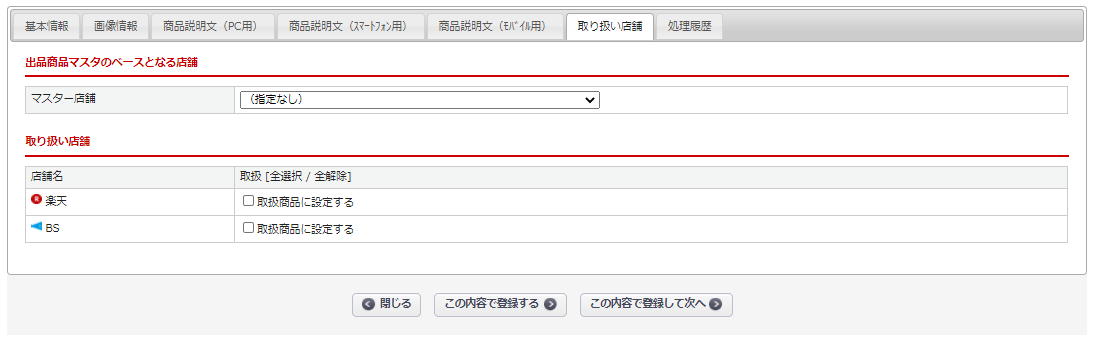 出品管理>出品商品登録>「取り扱い店舗」タブ