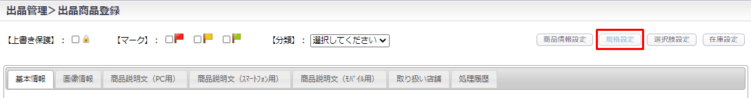 「出品管理>出品商品登録」画面右上の【規格設定】ボタンから設定します。