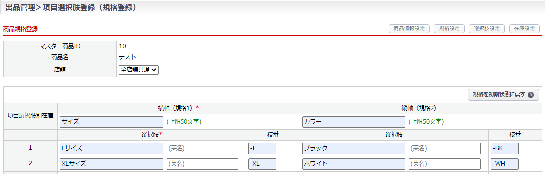 | 選択肢 | 規格の選択肢を設定してください。 |