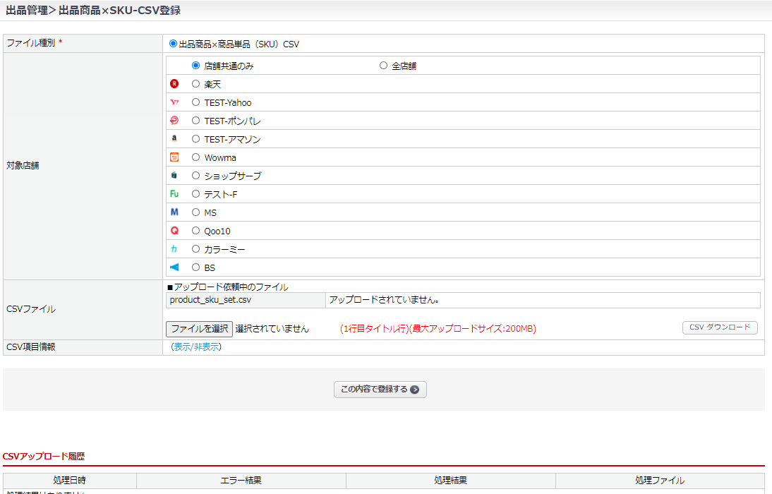 ※あらかじめ、出品商品と商品単品(SKU)の登録を行ってください。
