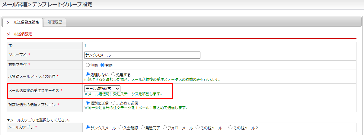 「メール送信後の受注ステータス」に、メール送信と同時に変更する受注ステータスについて設定しているか、確認して下さい。