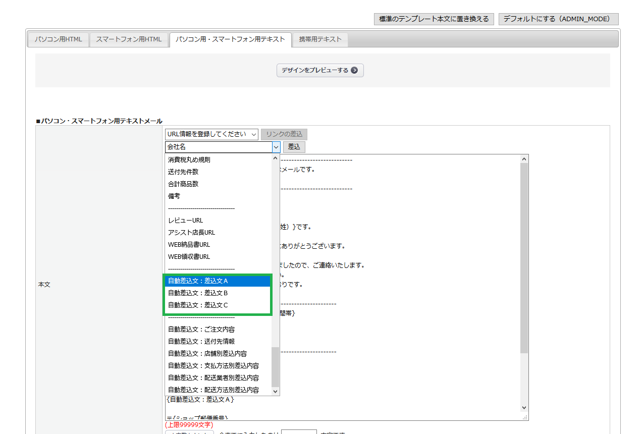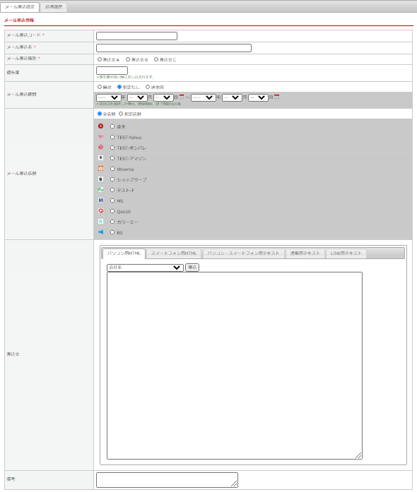 | メール差込名 | 差込文識別のための差込名を任意の文字列で指定します |