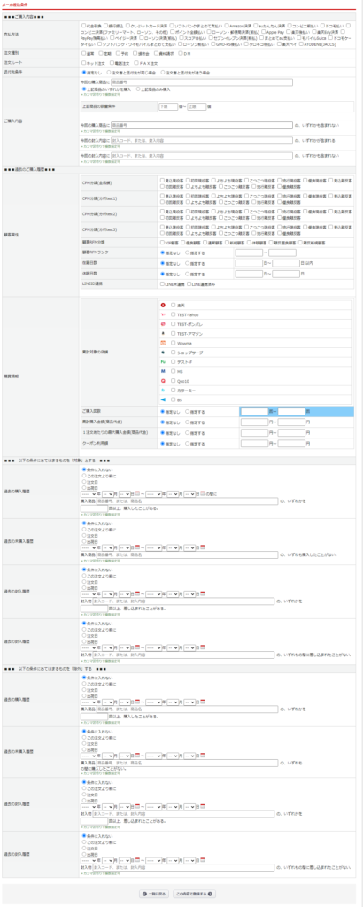 | 過去の購入履歴 | 過去の購入商品で条件を指定する場合に設定します。 期間、商品番号、指定商品の購入回数で条件の指定が可能です。 |